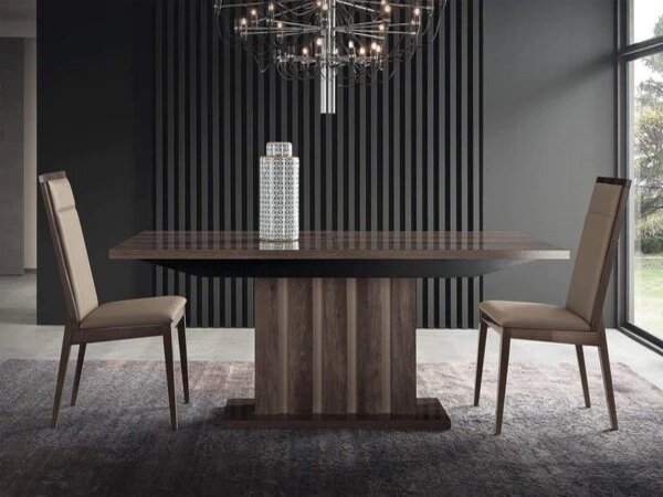 This gorgeous Italian dining collection would be a great addition to your dining room. Its stunning design and combination of gloss lacquer surface with grain surfaced matching finish will evoke lots of compliments from your family and guests.
