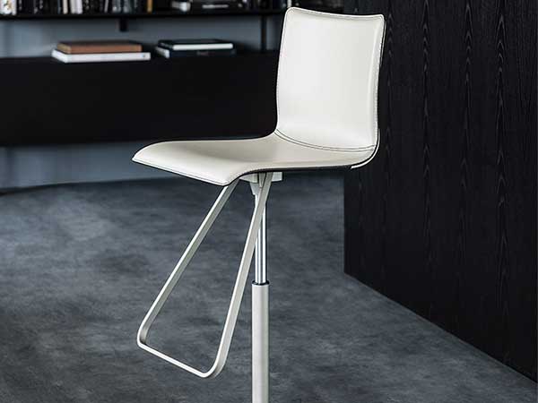 Swiveling ultralight stool, adjustable in height with 4 spokes base in polished aluminium and column, footrest and gas piston in chromed steel (08) or with base plate, column, and footrest in black (GFM73) or titanium (GFM11) embossed lacquered steel and gas piston in chromed steel (08). Frame covered in leather as per sample card. Standard or in contrast stitching.
