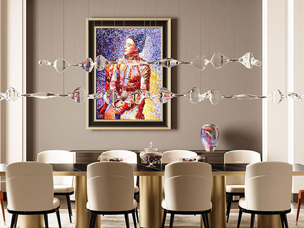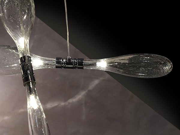 The modules are in transparent blown glass with bubbles and with a chromed metal joint on which the LED bulbs and the electrified suspension cable are inserted.