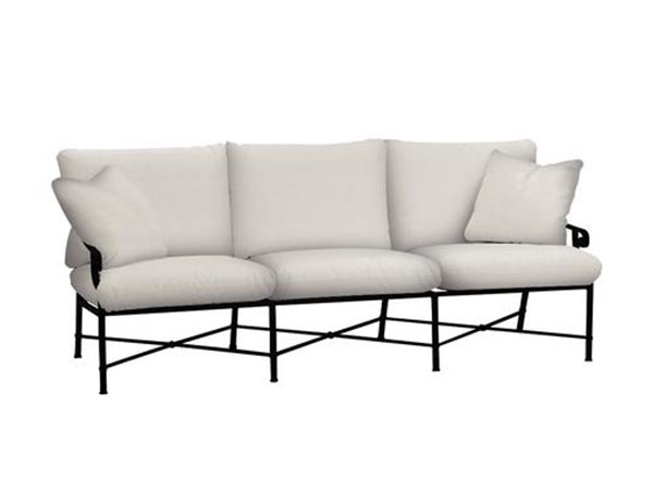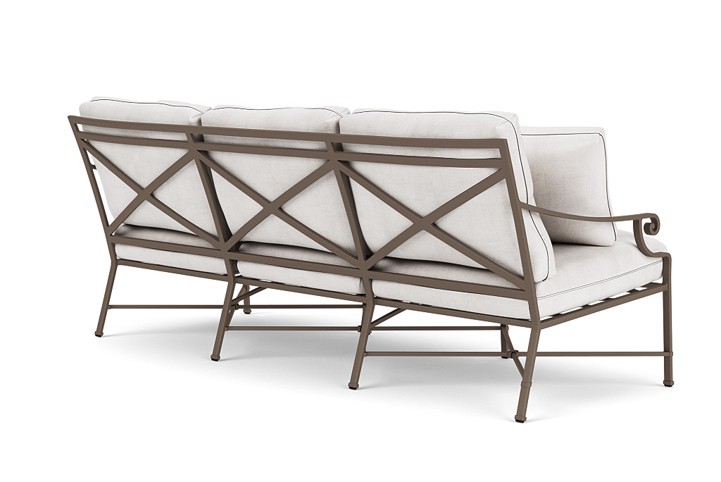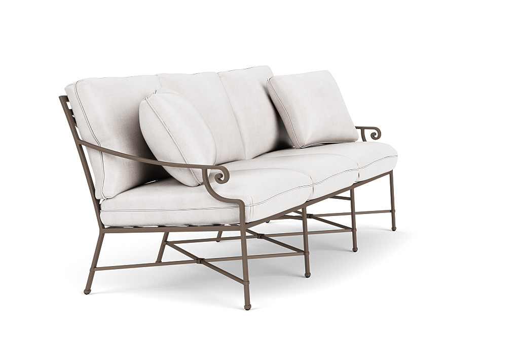 Venetian’s refined silhouette is highlighted by timeless Neoclassic details. The x-back and cross-stretcher are framed by elegantly scaled rectangular lines, including a subtly flared and contoured back. Gracious spiral volute details at the end of the arms, architectural banding details on the legs, and the cross-stretcher are proportionately placed to enhance the overall balance. The Venetian Outdoor Sofa easily accents eclectic outdoor living scapes that require a more formal design presence. Includes 2 square pillows.