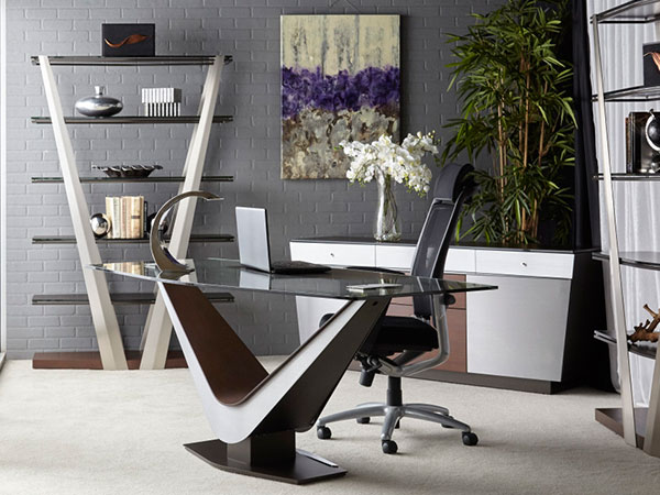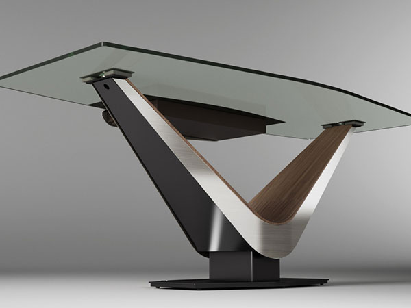 yseries and reconfigured it as a premier work environment, whether for your home office or your corner office. Never has high style had so much function. All your power access and wire management needs are addressed— we’ve included a prewired power strip with surge protector and USB power outlets. Just open either magnetically-latched fold-down access panel, make your connections, and simply close the panel— no tools needed. You can run all your cables through either of the access grommets on the generous desktop. The tempered glass desk top features a show-stopping acid-etched Sable glass “blotter” which covers a brushed stainless-fronted pencil drawer. The tapered chevron-shaped body, clad in brushed stainless panels and rich walnut veneer, conceals all wiring and connectors—leaving only pure style. There’s also a rolling file cart which cleverly plays off the reverse hourglass shape of the desktop with contrasting brushed stainless and walnut drawer fronts. Victory desk, file cart, and a matching credenza are available in any Elite powder-coat finish. Choose the perfect finish for the walnut veneered components. The Victory family also includes cocktail, end, console and various dining tables.