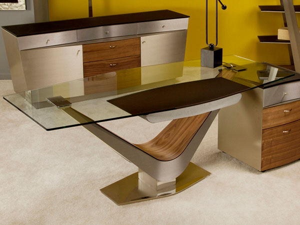 There’s also a rolling file cart which cleverly plays off the reverse hourglass shape of the Victory desktop with contrasting brushed stainless and walnut drawer fronts. The sable glass top, acid-etched to prevent fingerprints, matches the desk top blotter. The metal side-panel are available in any of Elite’s powder-coat finishes. Of course, this mobile file comes with 4 locking castors and an anti-tilt caster on the file drawer to prevent tipping. The file drawer accommodates either letter or legal hanging files. The walnut veneer drawer fronts are available in a variety of finishes.