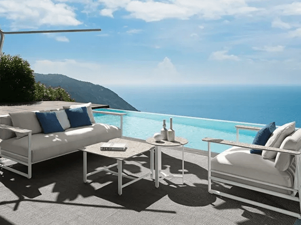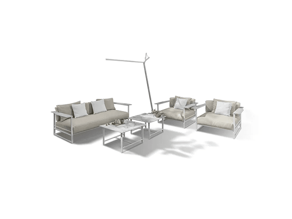 The Viera two-seater sofa stands out for its elegant and bright lines that perfectly adapt to your outdoor living space. The refined aesthetics and the fine materials do not compromise the functionality of this product, ensured by the aluminium frame. The quick dry foam padding is upholstered with weather-resistant and removable covers, available in three different colours, wisely combined with the shades of the frame and of the gres armrests.